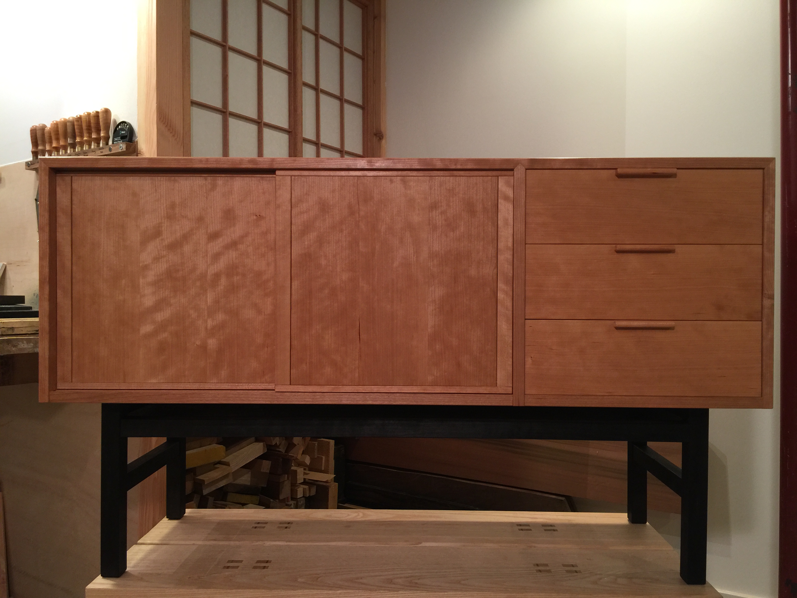 Hello and welcome to my blog! This post continues a series in which I’m building The Floating Credenza of American black cherry. In this post I will detail the process of building a base frame for the previously floating credenza. I’ve designed a four legged base for the credenza, which I’ve dyed black, allowing the credenza to float in the abstract sense of the term. This post, the penultimate post in this series, will be followed by one detailing the process of building the cabinet back. While the series continues on the blog for one more entry, the cabinet is now at New Hope Arts’, residing in their gallery.