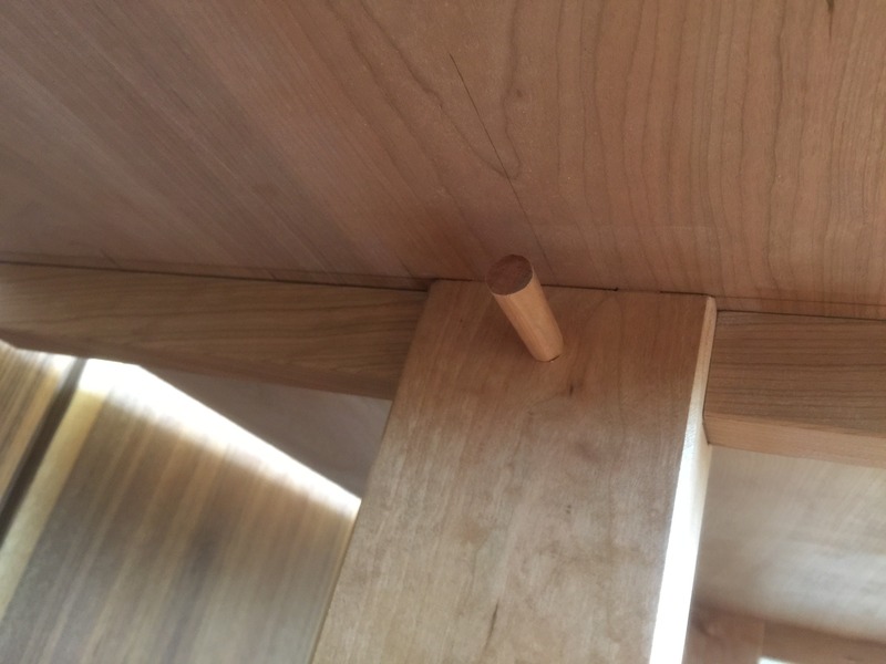 Finally the joints at top and bottom of the legs are secured by a round tapered peg at the top and glue at the bottom. I will change that to secure both top and bottom with square pegs. If ever the table should need refinishing I want it to be able to be completely disassembled with ease.