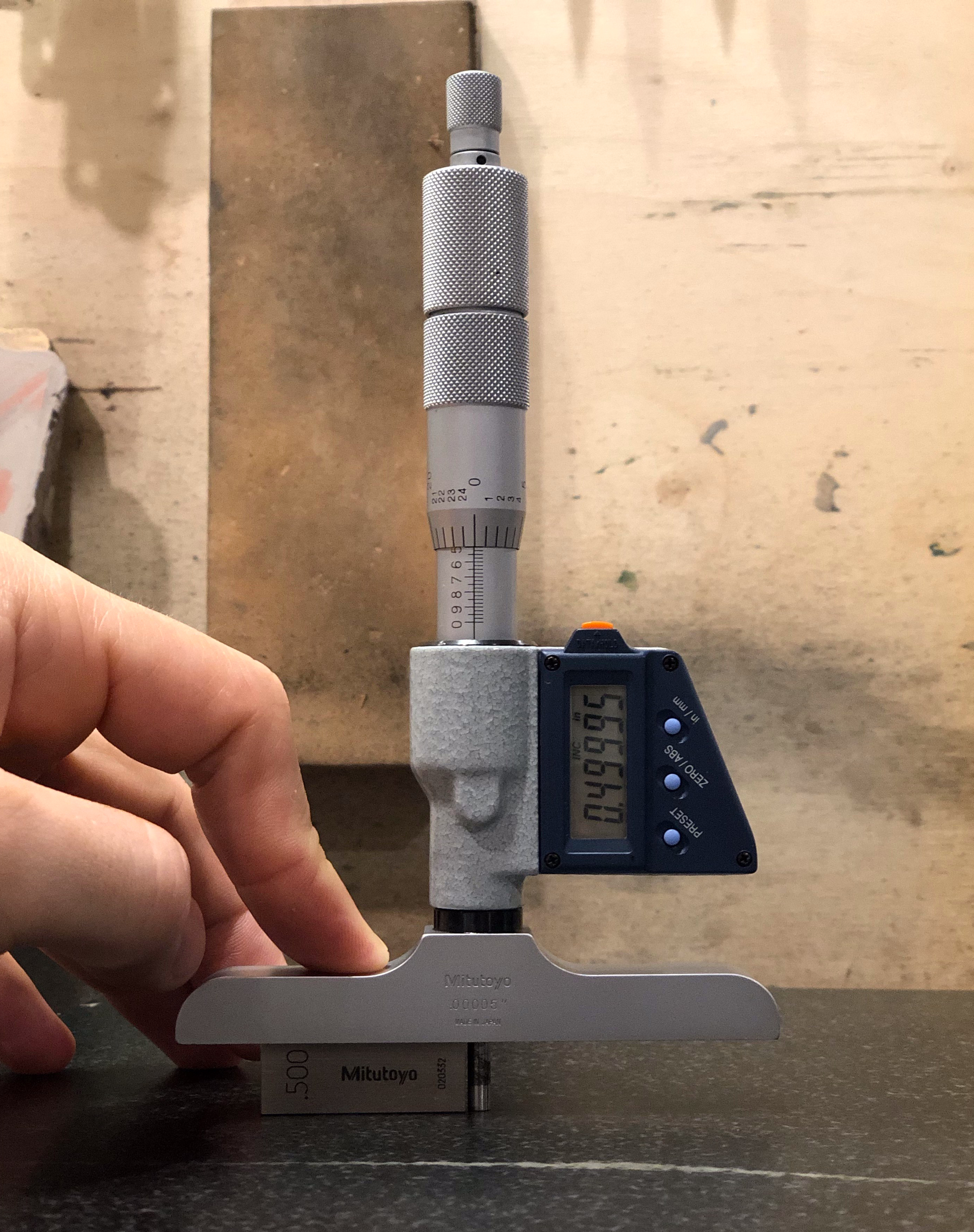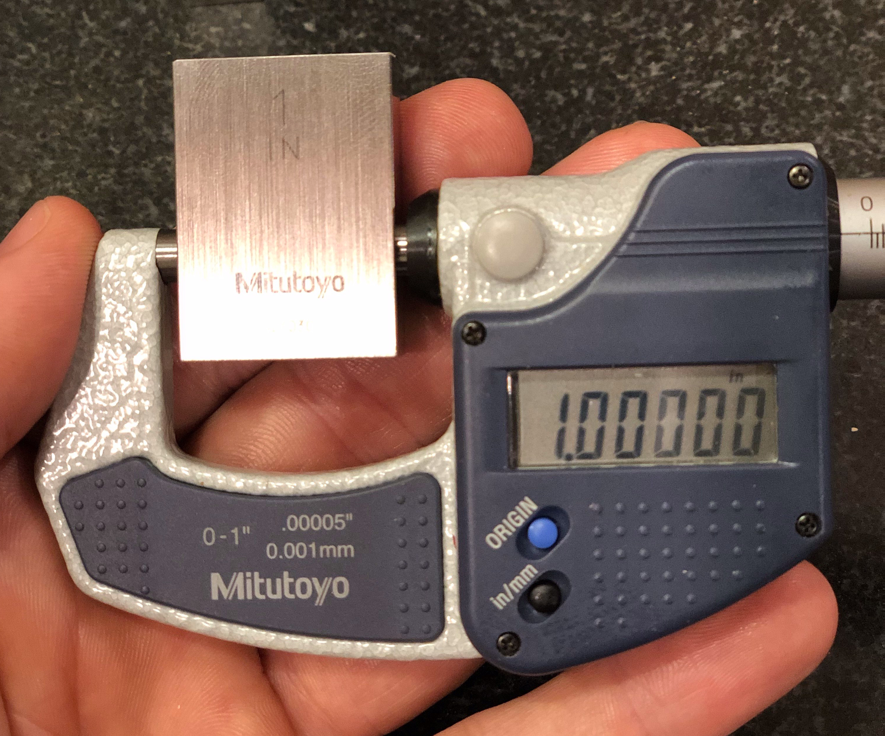 Next I check the depth micrometer and the outside micrometer to ensure that they’re reading accurately. The first step I take is to ensure an accurate zero position. This is one in which the dial stops at exactly 0.00000″ when the spindle closes against the anvil on the micrometer and when the spindle is flush against the surface plate on the depth micrometer. The digital aspect of the gauge can be easy reset to zero if it reads otherwise. I use the micrometer’s ratchet’s to ensure that the positions are closed down to accurately.